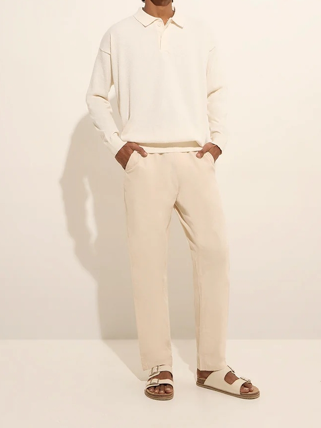 These beige chinos are carved in a relaxed-fit frame. Made from quality fabric, the mid-rise bottom wear carries a smooth elastic waistband, adjustable drawstrings and multiple pockets.
