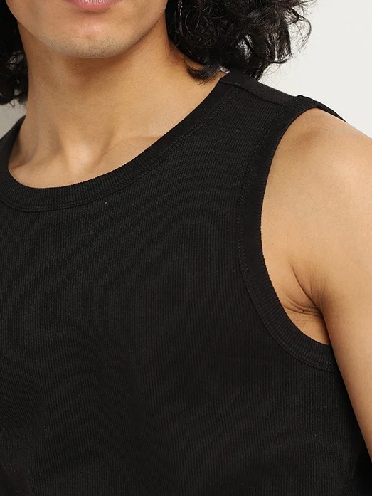 Our black t-shirt is a versatile piece to add to your wardrobe. The crew neck and sleeveless design create a relaxed yet sophisticated look, while the soft fabric ensures comfort throughout the day. Pair it with denim or chinos for a casual yet chic outfit.