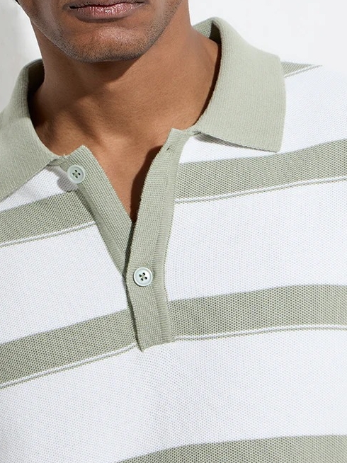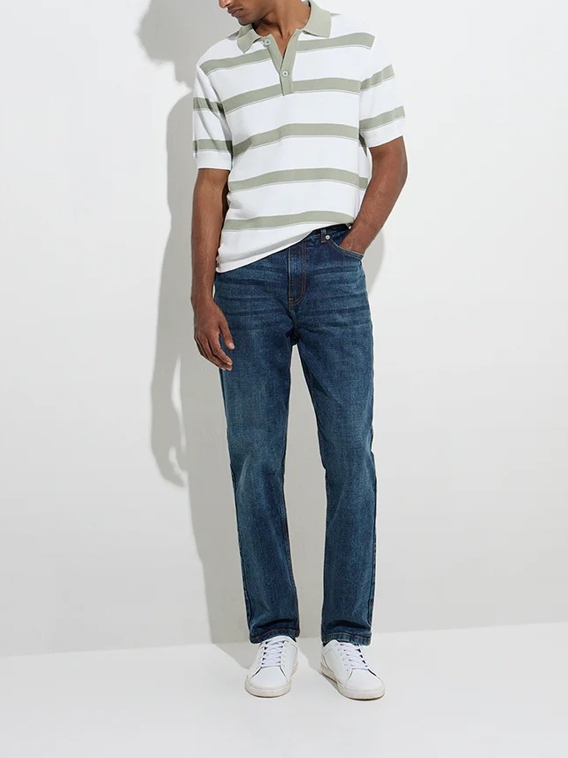 This navy polo t-shirt Casuals showcases classic stripes for a timeless appeal. Crafted from a knit-textured fabric in a relaxed contour, it is complemented with a spread collar, a sleek two-button placket, and half sleeves.