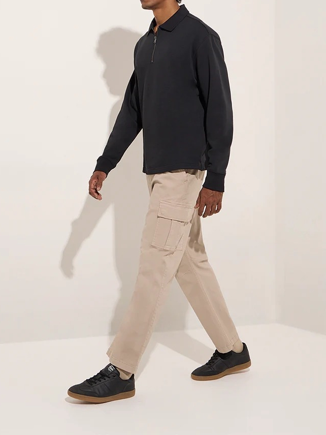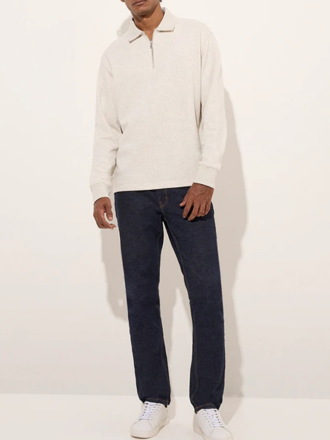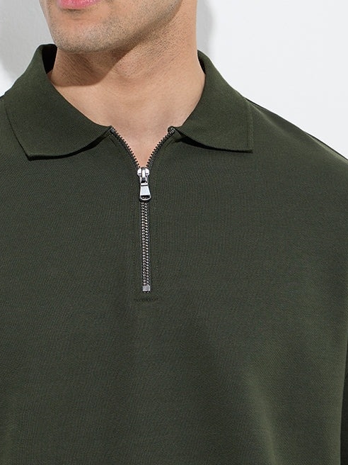 This olive sweatshirt is crafted in a relaxed fit for ultimate comfort. Designed with a spread collar and a short zipper placket, it features full sleeves for added warmth. Made from a soft cotton-blend fabric, it offers a cozy feel, making it an ideal choice for laid-back days.