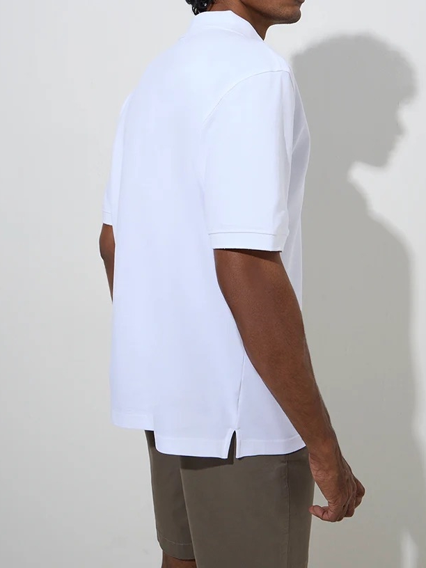 This white polo T-shirt Casuals is crafted from a soft cotton blend for all-day comfort. Designed in a relaxed fit, it features a sleek polo neck collar and half sleeves, offering a perfect blend of casual ease and refined style.