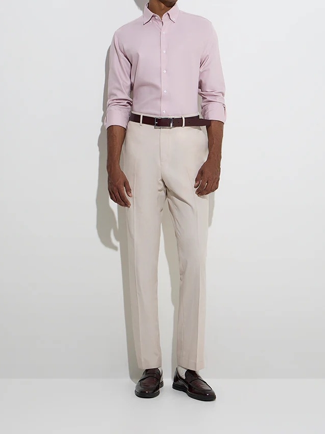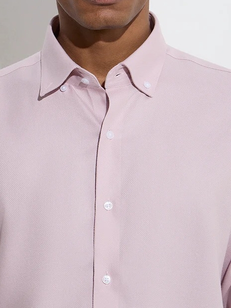 This dusty pink shirt, tailored in a sharp slim-fit silhouette for a modern, polished look. Crafted from a cotton-rich fabric, it offers a breathable feel with a refined finish. The button-down collar and full sleeves with buttoned cuffs enhance its structured appeal.