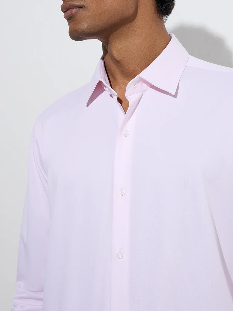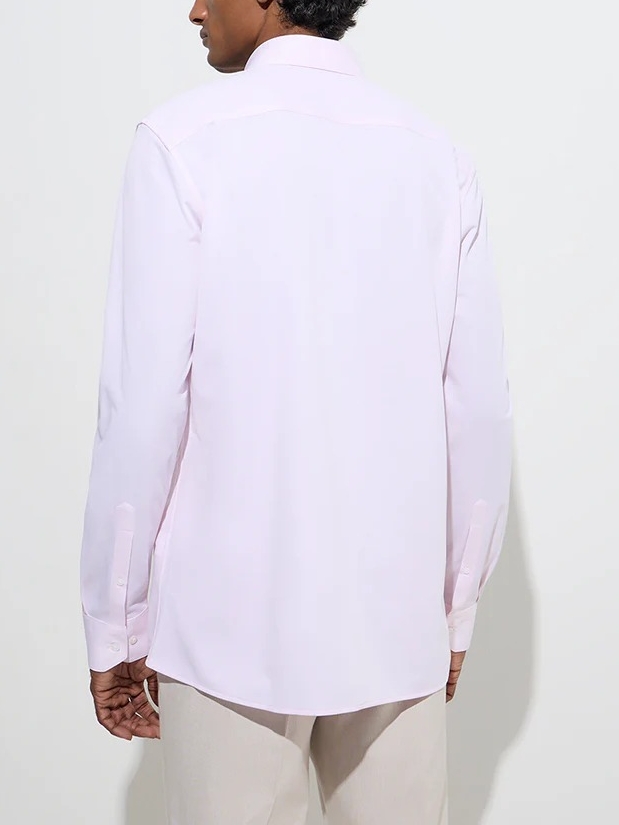 This pink shirt is tailored in a sleek slim-fit silhouette for a sharp, modern look. Crafted from a breathable fabric, it ensures all-day comfort without compromising on style. The semi-spread collar, full sleeves, and button-up front add a touch of refinement.