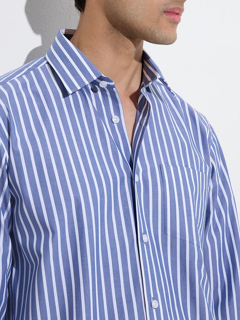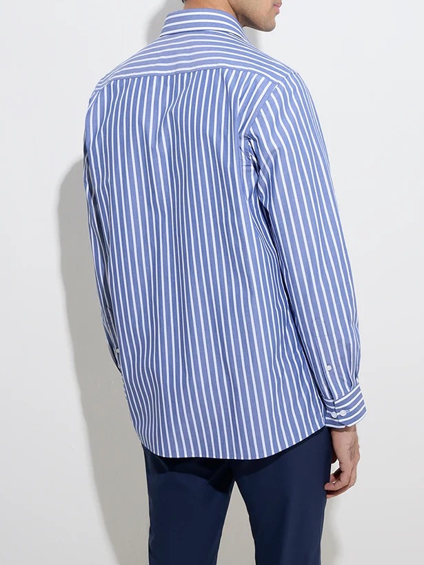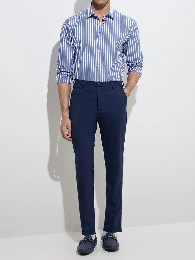 This shirt launches this navy striped shirt, crafted from pure cotton for a crisp and breathable feel. Tailored in a slim-fit profile, it features a spread collar, button-down front, full sleeves, and a front pocket for a polished finish.