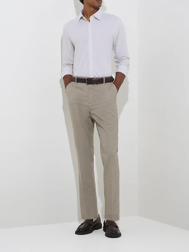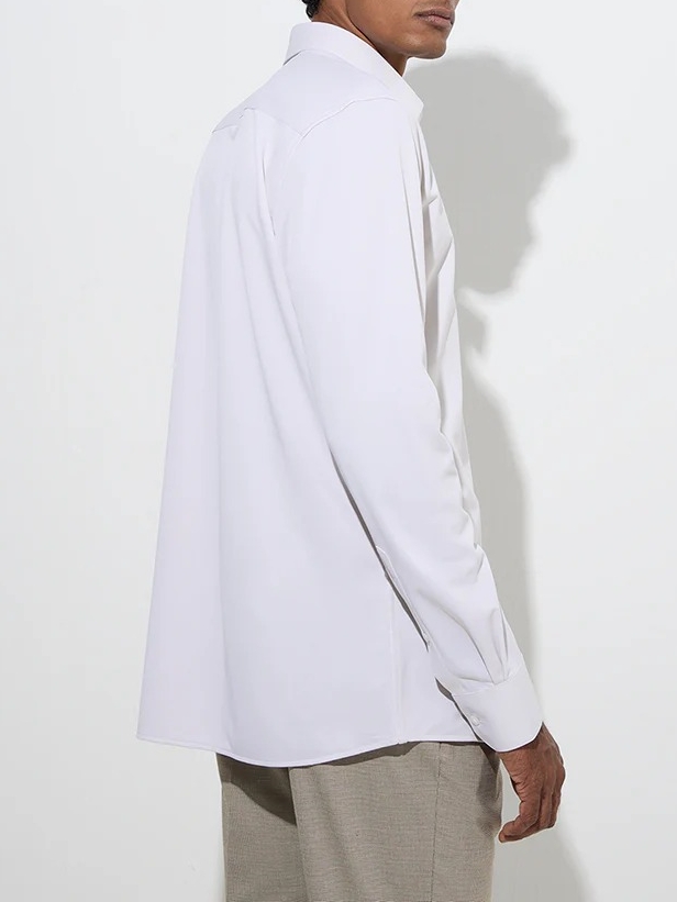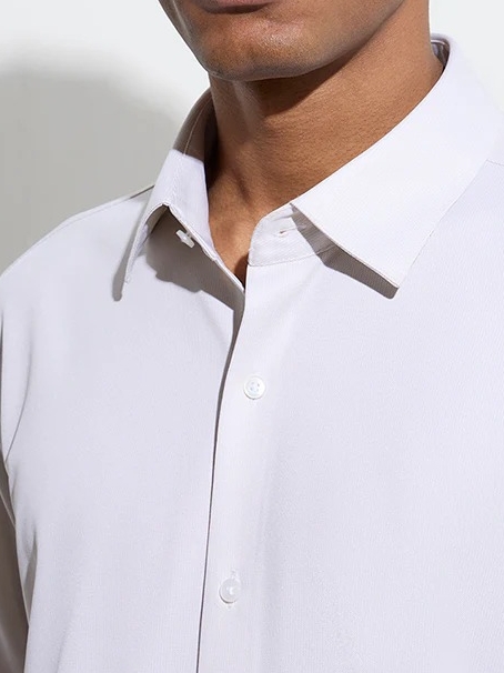 This off-white shirt Formals is tailored in a slim profile for a refined, modern appeal. Crafted from a lightweight fabric, it offers a luxuriously soft feel while maintaining a crisp, polished look. Designed with a spread collar, a button-up front, and full sleeves with buttoned cuffs, this versatile piece effortlessly balances comfort and sophistication.