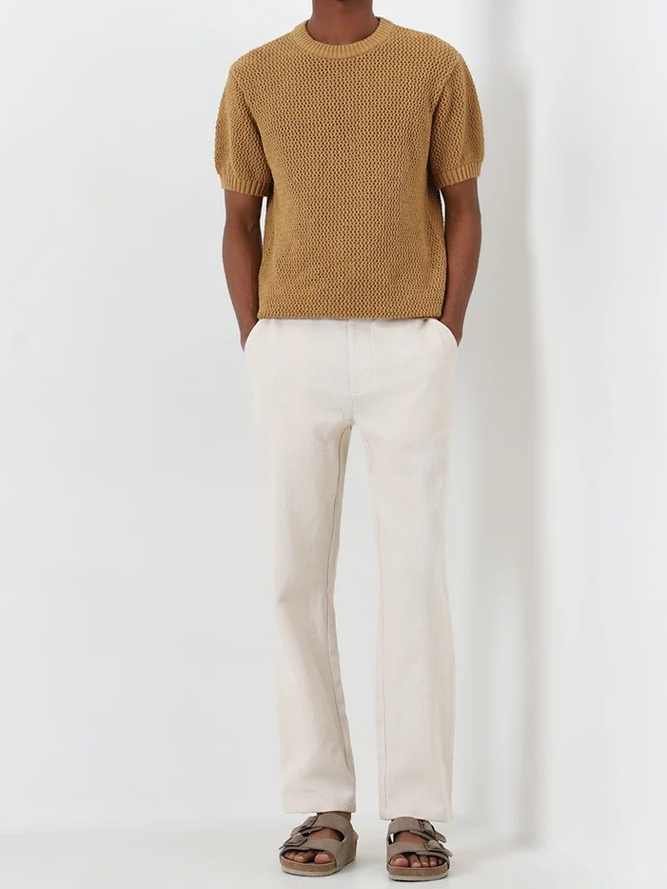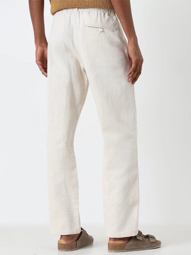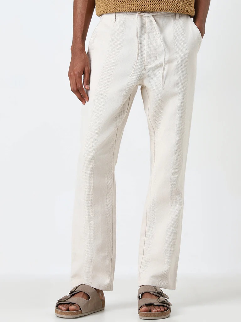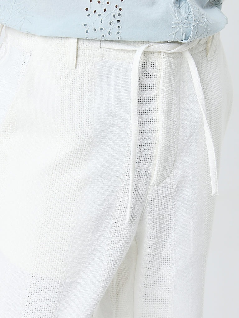 This pair of chinos is designed with self-stripes. It is fashioned from pure cotton and comes fitted with an elastic waist featuring drawstrings, belt loops and multiple pockets.