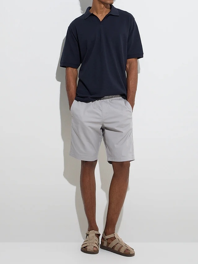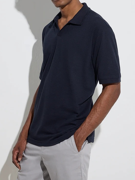 This navy polo t-shirt Casuals is cut in a relaxed profile, offering a perfect balance of comfort and style. Crafted from a cotton-blend fabric, it showcases a refined self-textured design, complemented by a spread collar and half sleeves.