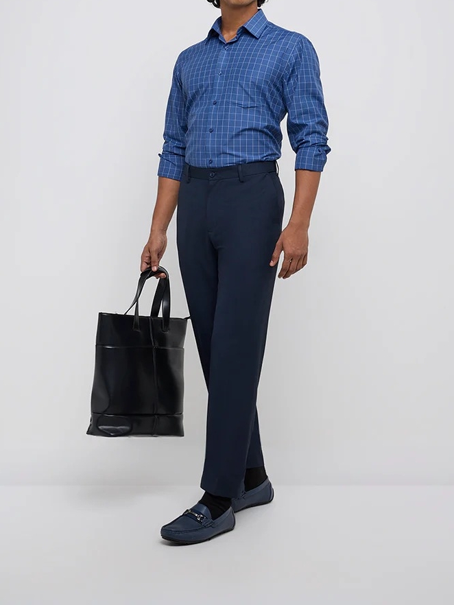 These navy trousers in a slim-fit profile. The mid-rise bottom wear offers comfort with its pure cotton composition. Its smooth buttoned waistband, zipper fly, belt loops and multiple pockets elevate its functionality.