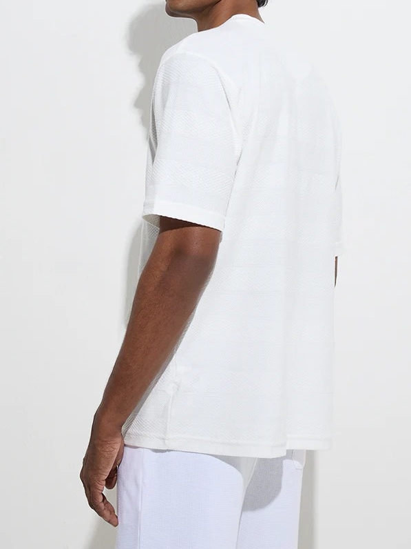 This white t-shirt Lounge features a subtle self-textured design, adding depth to its classic look. Crafted from a breathable fabric, it is tailored in a relaxed fit for easy, all-day comfort. The round neck and half sleeves enhance its laid-back style.