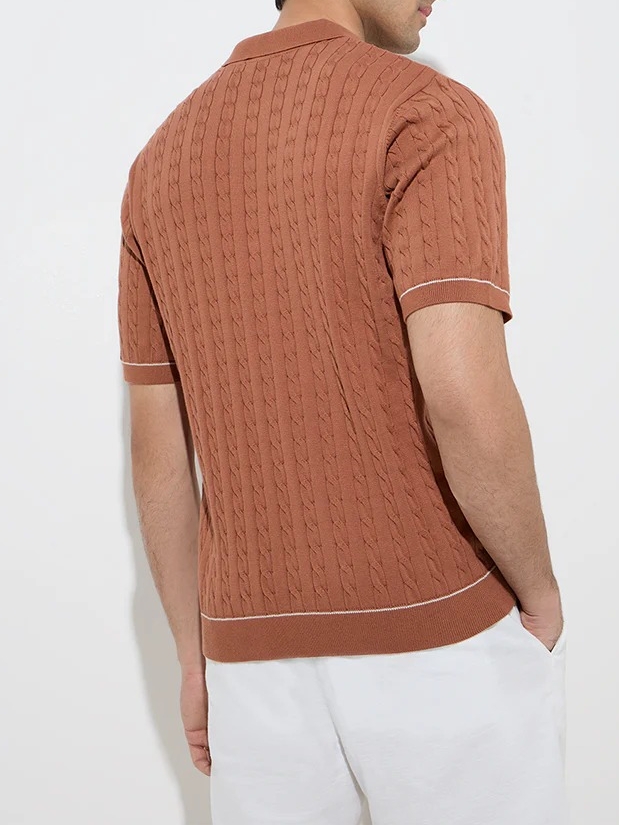 This rust polo t-shirt showcases a cable-knit pattern for a textured finish. Crafted from a cotton-blend for sumptuous comfort, the relaxed-fit separate features a spread collar with a brief buttoned placket and half sleeves for effortless style.